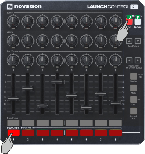 The Novation Launch Control XL offers 16 different MIDI Templates (pages) - 6 Factory and 6 User ones - which can be selected by pressing the FACTORY or the USER Templates button and 1 of the 8 Track Control buttons.