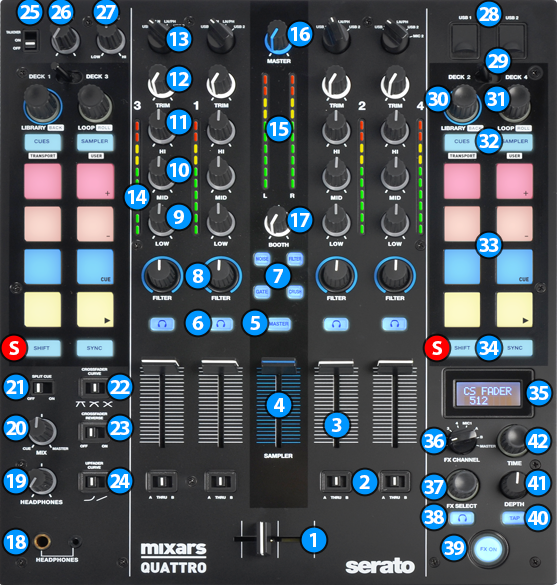 S SHIFT: Hold these buttons down to access secondary functions of Mixars Quattro (mainly in black lettering inside a white box)