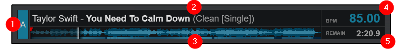 - DECK INDICATOR. The Deck Indicator highlights the current active or working deck. It will switch automatically to the opposing deck when a song is loaded but can also be clicked on manually to bring the preferred deck into focus.