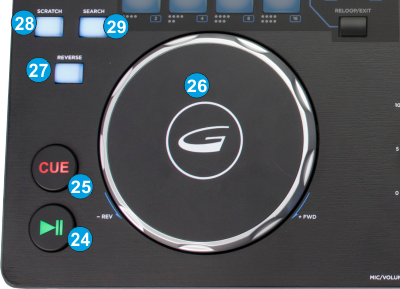 If the Deck is paused, you can press and hold the Cue Button to play the track from the Temporary Cue Point. Releasing the Cue Button will return the track to the temporary Cue Point and pause it. - JOG. Touch sensitive jogwheel. Use the jogwheel to scratch or bend (depending on the Vinyl/Scratch mode selection) or fast seek through the track if the Search mode is enabled.